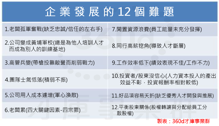 戰略性人力資源激勵的核心任務是依據公司戰略需要和員工的績效表現對員工進行激勵,通常公司常用的激勵措施,除了績效考核與獎勵方案以外,還有年終獎金、專案/提案改善獎金、股票/盈利分紅等,然而,「股權激勵」(合夥人制)乃是現代管理普遍認為最有效的長期激勵措施,其主要的目的是可以解決企業發展所面臨的12個難題: