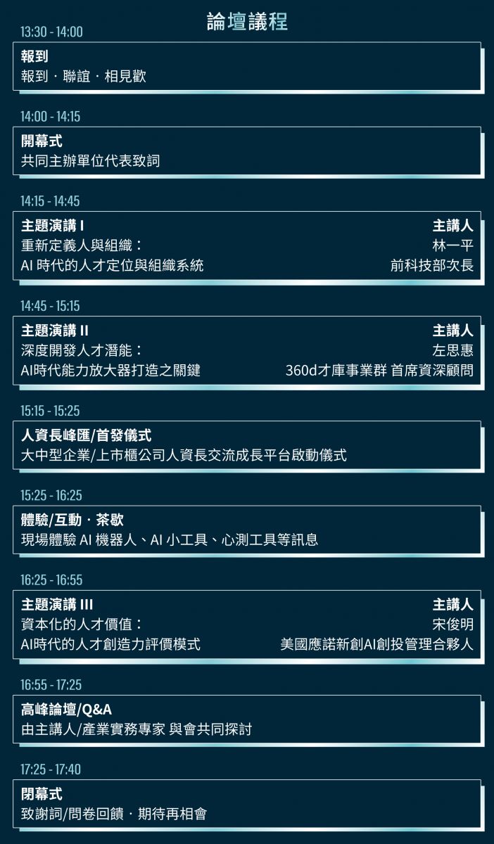 在 AI 迅速發展的浪潮下,企業如何重新定義人與組織的關係?本次論壇將深入探討 AI 時代下的能力放大器、人才創造力評價模式,並透過人才戰略價值工程,協助企業打造具備競爭力的永續發展路徑。